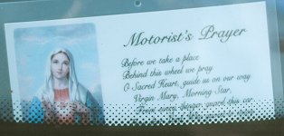 ![]() "Autofahrers Gebet 'Ehe wir hinter dem Steuer Platz nehmen, beten wir : O heiliges Herz, leite uns in deinem Weg Jungfrau Maria, (mein) Morgenstern" .... |